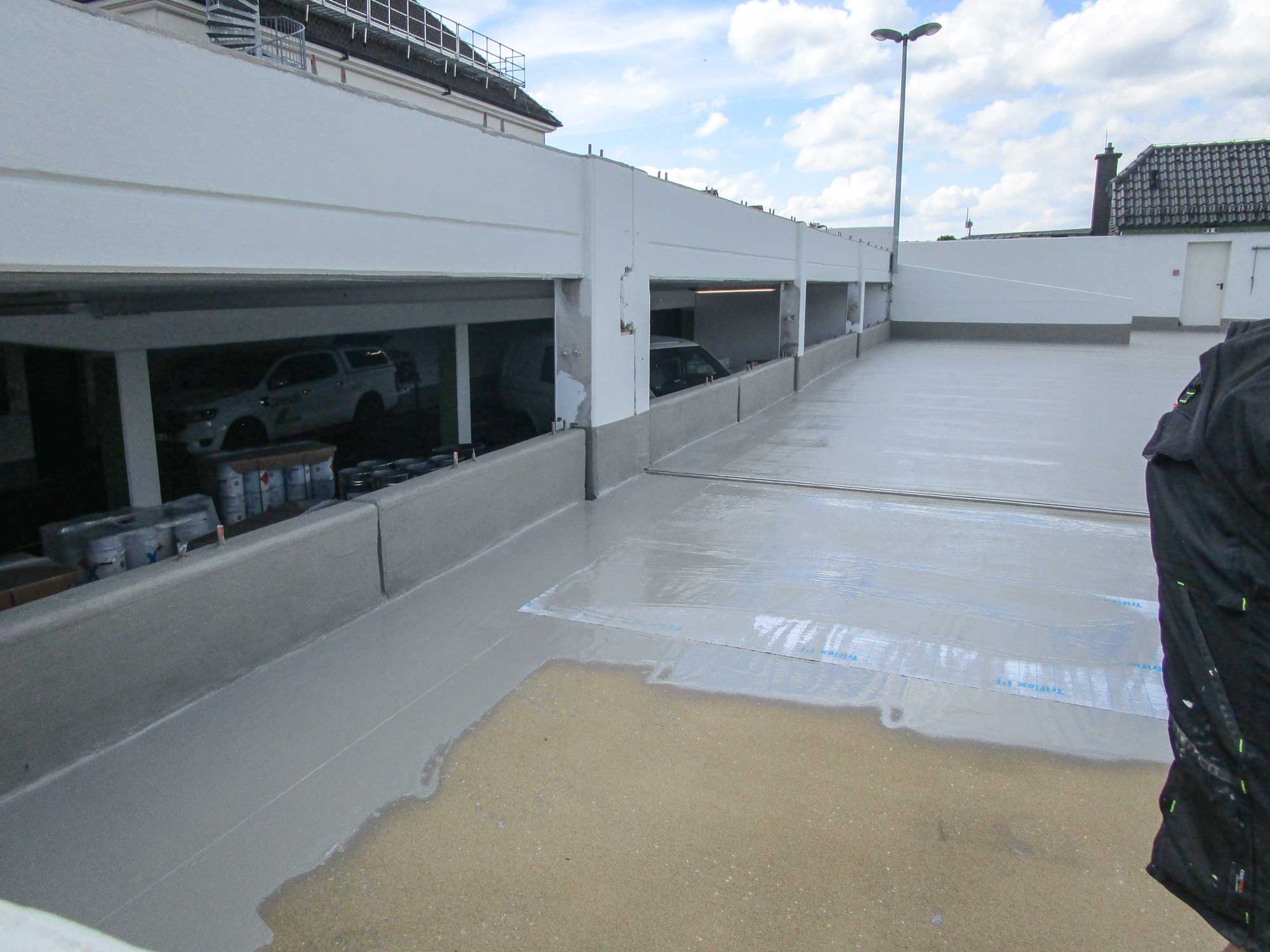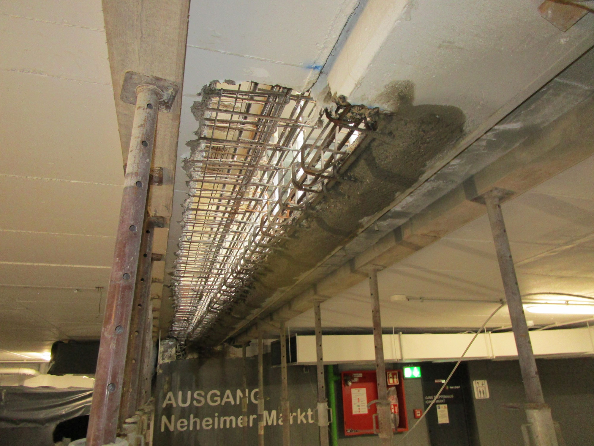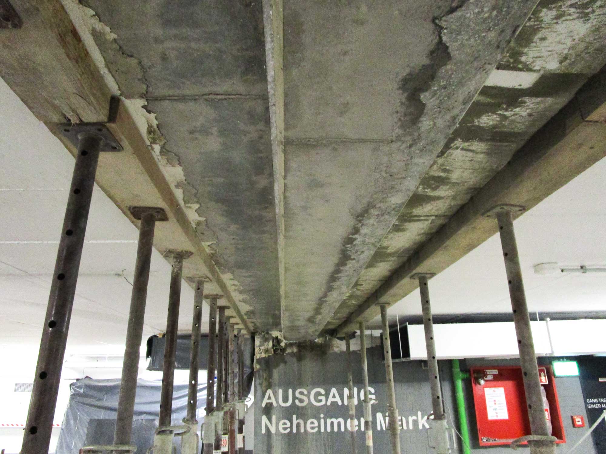 Die Betondecken wurden damals mit einem Bitumenemulsionsestrich versehen. Es wurde festgestellt, dass in den schadhaften Bereichen bzw. Flickstellen dieses Belags eine Chloridbelastung des Deckenbetons und der Wand- und Stützensockel besteht. Der schadhafte Beton wurde mittels Hochdruckwasserstrahltechnik entfernt und entsprechend geltenden Regelwerken reprofiliert. Bereits geschädigte Bewehrungen in den Bauteilen wurden ersetzt.
