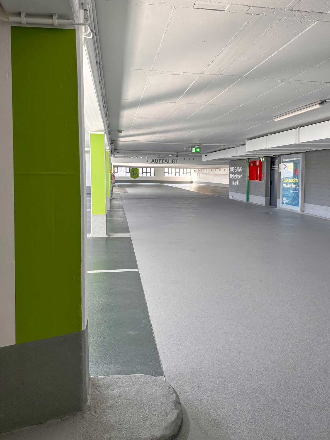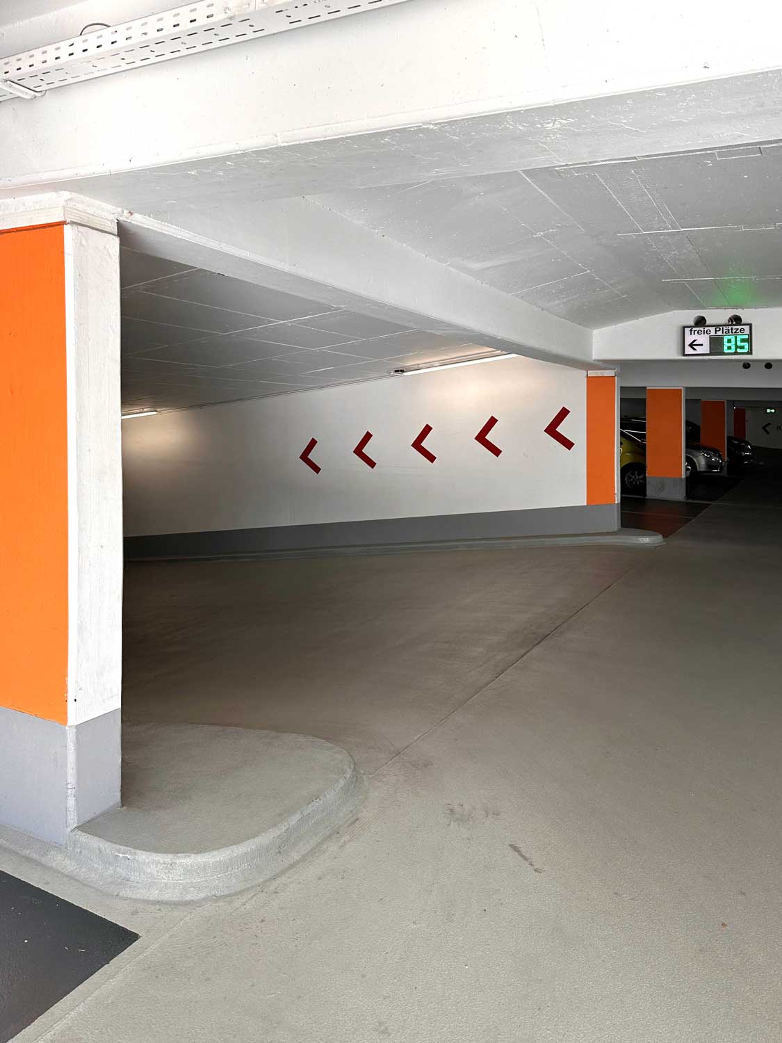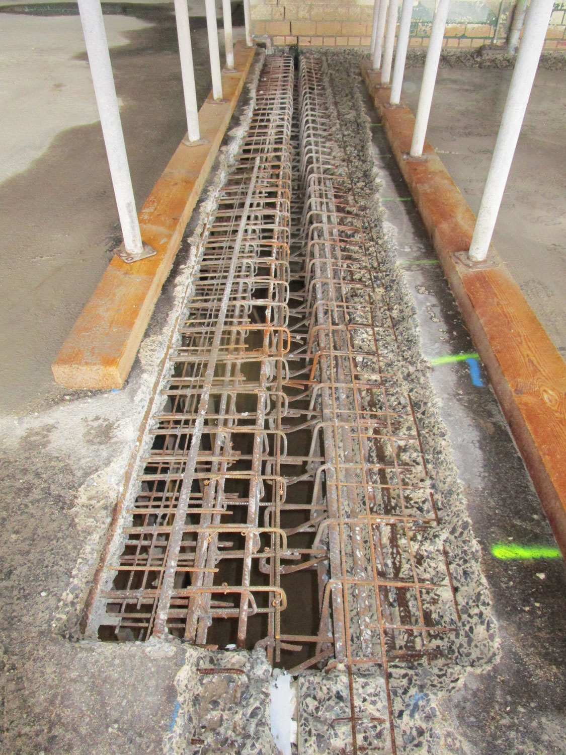 Die Betondecken wurden damals mit einem Bitumenemulsionsestrich versehen. Es wurde festgestellt, dass in den schadhaften Bereichen bzw. Flickstellen dieses Belags eine Chloridbelastung des Deckenbetons und der Wand- und Stützensockel besteht. Der schadhafte Beton wurde mittels Hochdruckwasserstrahltechnik entfernt und entsprechend geltenden Regelwerken reprofiliert. Bereits geschädigte Bewehrungen in den Bauteilen wurden ersetzt.