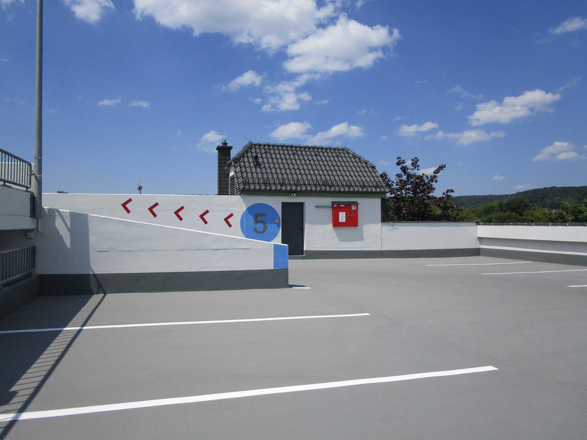 Im 2. Bauabschnitt wurde u.a. auch das Freideck saniert. Hier wurden der Gussasphalt Belag und die Abdichtungslage entfernt, die geschädigten Betonbereiche instandgesetzt, als neuer Oberflächenschutz wurde hier Flüssigkunststoff verwendet.